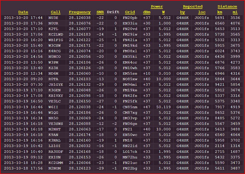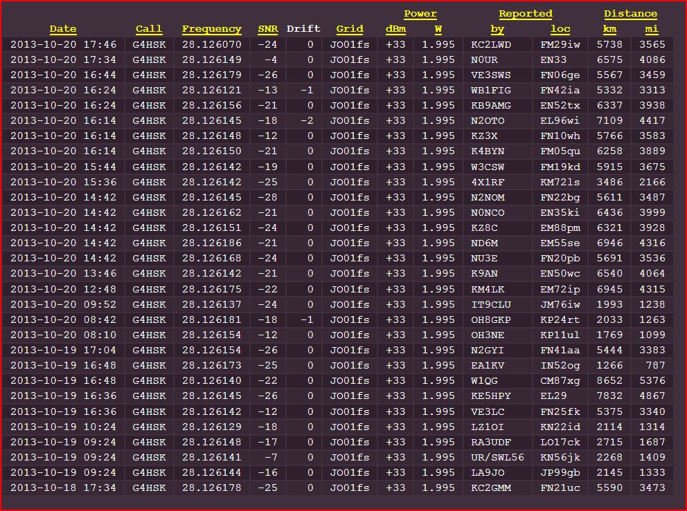 The results with this size loop, setup on a stand, indoors, have been very encouraging, running WSPR tests with less than 2W output have produced the following results: