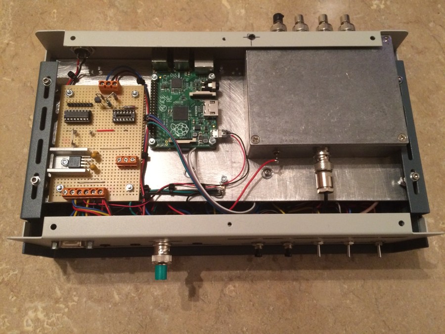 Underside, showing Raspberry Pi, DEMI 4 port DA and regulator + Lock monitoring board.