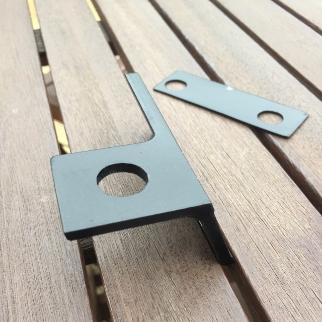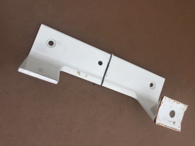 The following two photos show the bracket and filler plate after they were spray-painted to match the Yeti roof-rails. Note that some of the metal was masked off so that an earth connection was maintained.