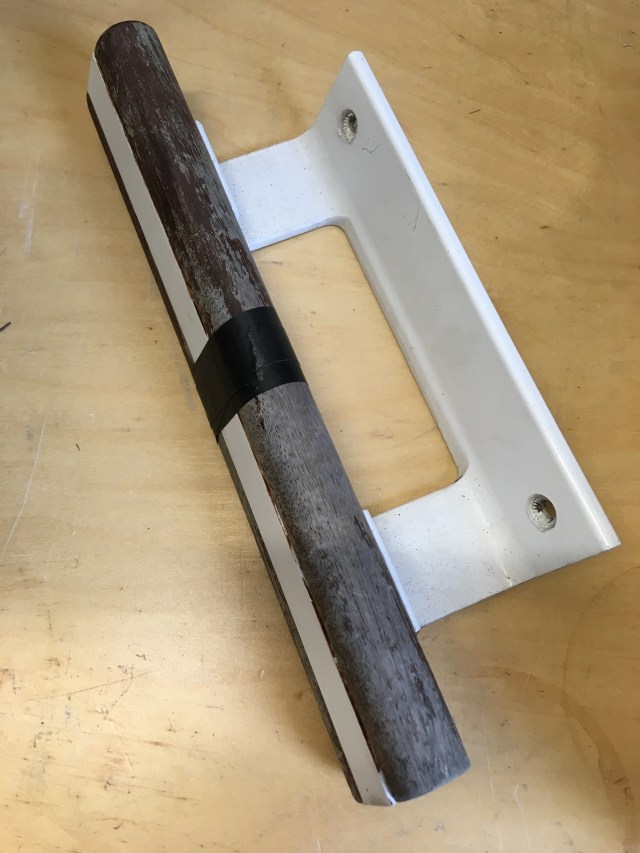 Now I’m not one to throw away items that I think may come in handy one day. I’d given up on trying to bend the aluminium sheet. So after much head-scratching and searching in the garage for something that might do the job. I came across an old patio door handle…