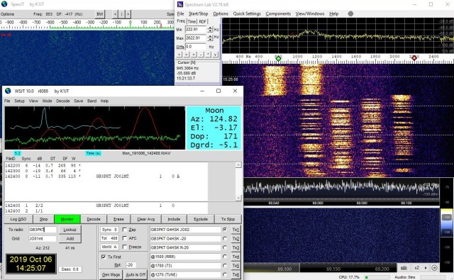 With the dish elevation set to about 5 degrees, I proceeded to slowly sweep the maximum arc possible out through the patio-doors. Doing this for a few minutes produced nothing. I then decided to point the dish up at about 20 degrees. To my surprise GB3PKT trace appeared on the screen, a tweak of the AZ / EL and it was audible! Here’s a screen grab showing the Doppler effect (~200Hz) and JT4g decode.