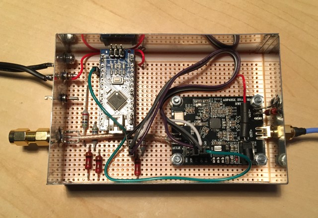 Like many of my smaller projects, copper-strip board formed the base for securing the modules and providing the inter-connections, level-shifters and so on. A tin box was used to house and screen the LO with the supply voltage fed via a feed-through capacitor. These steps being done to try to ensure the desired output was as clean as possible.
