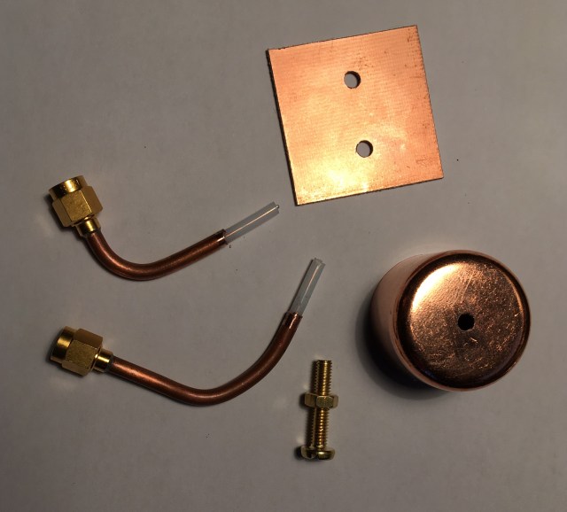 For 2400MHz I needed a 28mm end-feed pipe-cap plus a couple lengths of RG402 semi-rigid coax, two SMA connectors, a M4 brass screw, two M4 nuts and a small piece of good double-sided PCB. The following photo shows the parts (albeit with only one nut!):