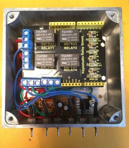 The heart of the sequencer is an Arduino UNO and a four relay board (Shield) that fits directly onto the Arduino. The use of this Shield simplifies the overall construction and provides four switched events. The Arduino and Shield operate from either 5V via the onboard USB socket or 7 – 20V (ideally max 12V) via the power socket / Vin connector. As my 10 GHz setup uses 12V / 28V I included an additional regulator so that the small onboard regulator on the Arduino board runs with only 9V input and doesn’t run too hot. To ensure that the Arduino was not affected by any strong RF signals and also that any harmonics (noise) from the Arduino clock (16MHz) were kept to an absolute minimum all the power and switch lines are via feed-through capacitors. The complete set of parts fit nicely into a Hammond die-cast box.