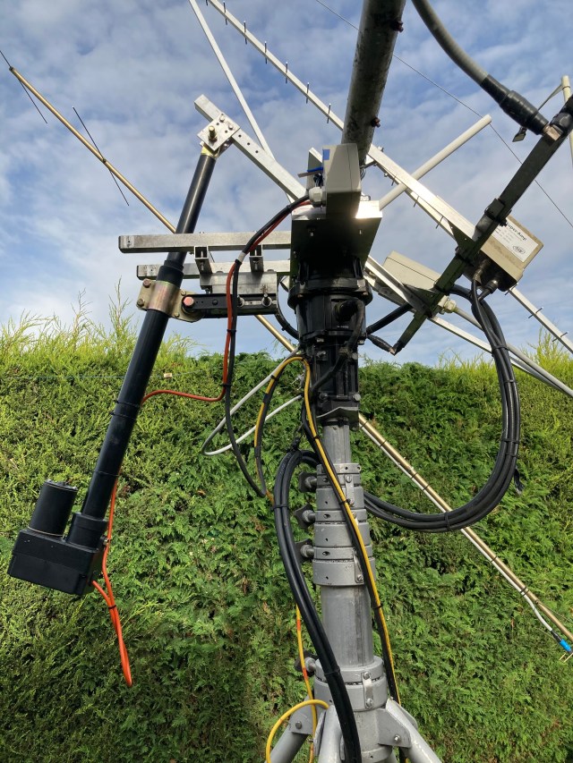 The photo above was taken during the initial testing of the new elevation system, and before the cabling was tidied! The maximum elevation is ~ 70 degrees which is fine for EME here in the UK.