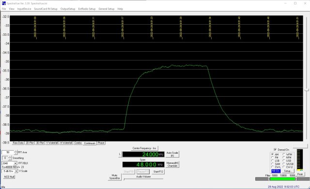 To ensure that what I was measuring was meaningful I used a stepped attenuator between output of the transverter and the input to the K3. By attenuating the input to the K3 in 1dB steps I could check that the measurement seen in SpectraVue did the same.