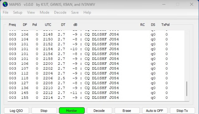 The above screen grab from Map65 shows the decodes from DL0SHF over a 30 minute period where the G-650C rotator is auto-tracking the Moon. You can see a 4dB variation over that period with -8dB being the best decode. With manual control, and peaking on Moon noise it’s possible to track and keep the beacon close to consistent -9dB as demonstrated in an earlier photo.