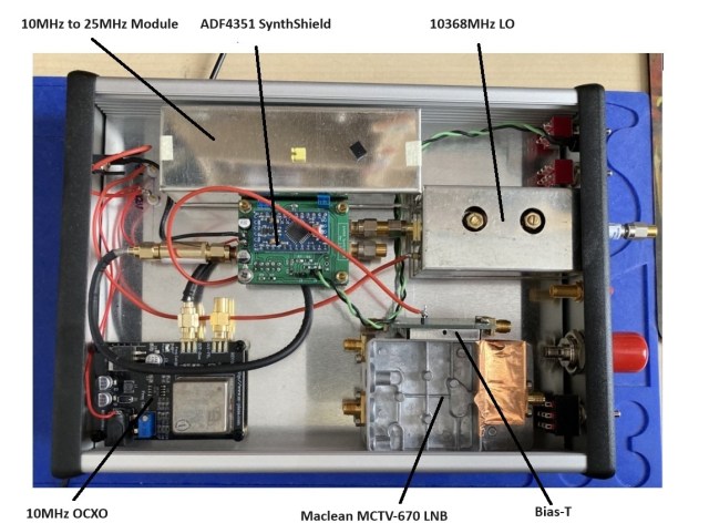 I have now used this relatively low cost LNB in a number of projects. It’s easily modified to produce a compact module with SMA connections. The ref-locked output from the LNB (618MHz = 10368MHz) is ideal for my Rigol SA and allows me to get some basic idea of whats happening several hundred MHz either side of 10368MHz. More details about modifying the LNB can be found here.