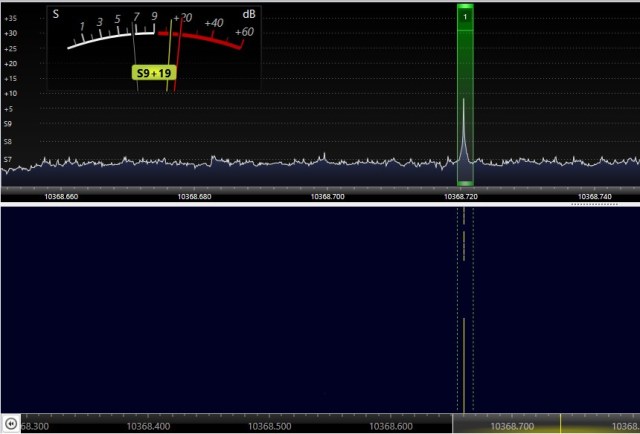The following photo shows the beacon being received on 10368.720MHz It’s just transitioned from carrier to the start of the CW. The first “V” ( … _ ) of the “VVV G4HSK/B JO01fs” CW Ident can be seen.