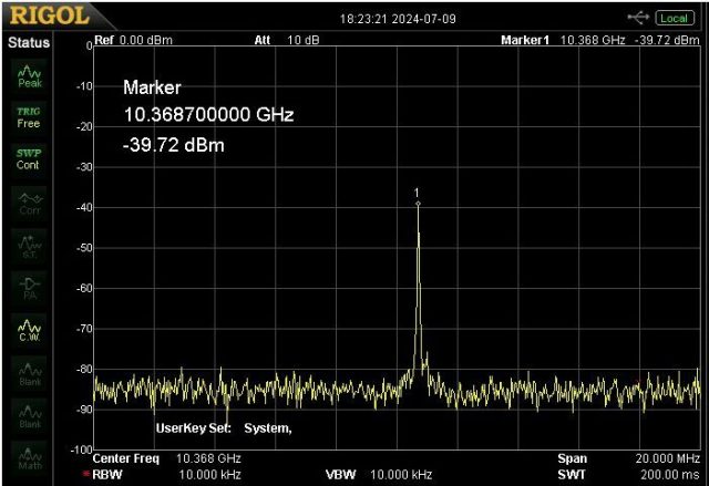 The SA Down Converter works as expected. The screen grab below shows a test signal from the 10GHz beacon on the Rigol DSA815-TG.