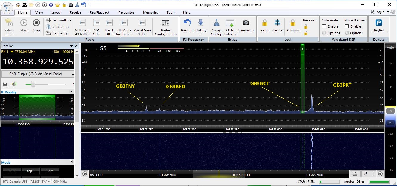 In addition to GB3PKT two other beacons appeared on the waterfall, GB3BED in Bedford and GB3GCT in Newbury. GB3GCT was a new one from the home QTH. A short time after a new trace appeared on the waterfall and slowly increased in strength. This turned out to be GB3FNY in Finningley, Yorkshire over 200km away.