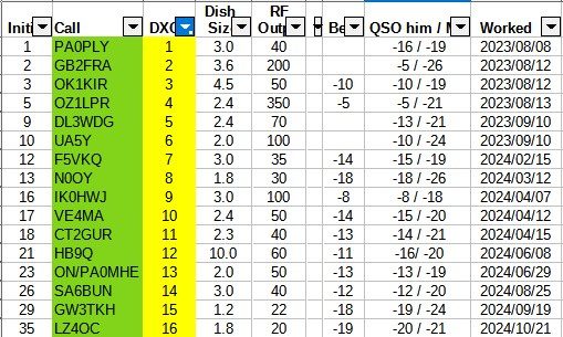 You might expect all of my QSO partners to have been using large dish setups, i.e. at least 2.4m or bigger and QRO. That’s not the case at all as can be seen in the table below. More small dish stations are becoming active with optimised 1.0 -1.5m dish installations, now when conditions are good it’s not uncommon to see them completing successfully with stations using a 1.8m dish or smaller.