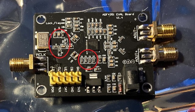- To disable the onboard 25MHz source on most of the boards I’ve used I simply removed two SMD parts, the 0R link (R5) and L1 (Vdd feed). An external Frequency source (usually 10MHz) could then be used via the MCLK SMA socket. Two boards that I purchased recently were missing a 0R (R8) on the MCLK input track to enable the external source to reach the REFIN pin on the ADF4351 chip. So in addition to removing the two components a 0R needed to be soldered in place.