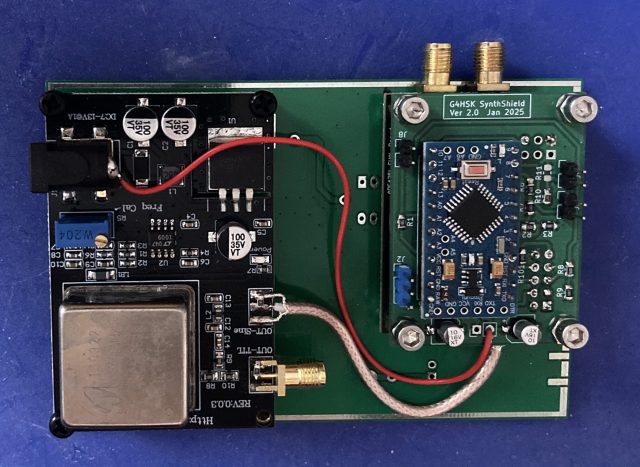 Once this new LO is put in an enclosure I will add an SMA input socket and power switching so that the ADF4351 SynthShield can work with either an external 10MHz GPSDO reference or the internal 10MHz OCXO.