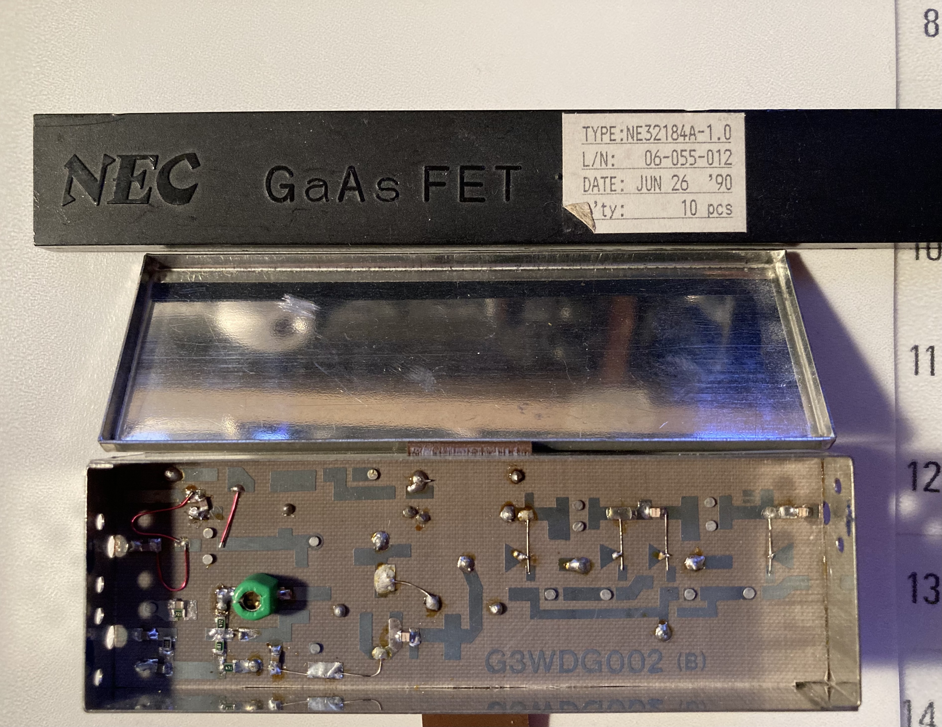 Whilst I still had the box of parts and a partially completed converter I was missing the build documentation. Fortunately a quick online search resolved that issue and I found all I needed here… thank you Dave. Checking the parts list I found that I was missing the 2K2 preset pots and I didn’t have the required Birkett red or black spot GaAs FETs. Fortunately I did have the mixer diode and a packaged strip of 10 NEC NE32184A GaAs FET devices. I guess someone at the time, with far better knowledge than me, decided that these were a good option.